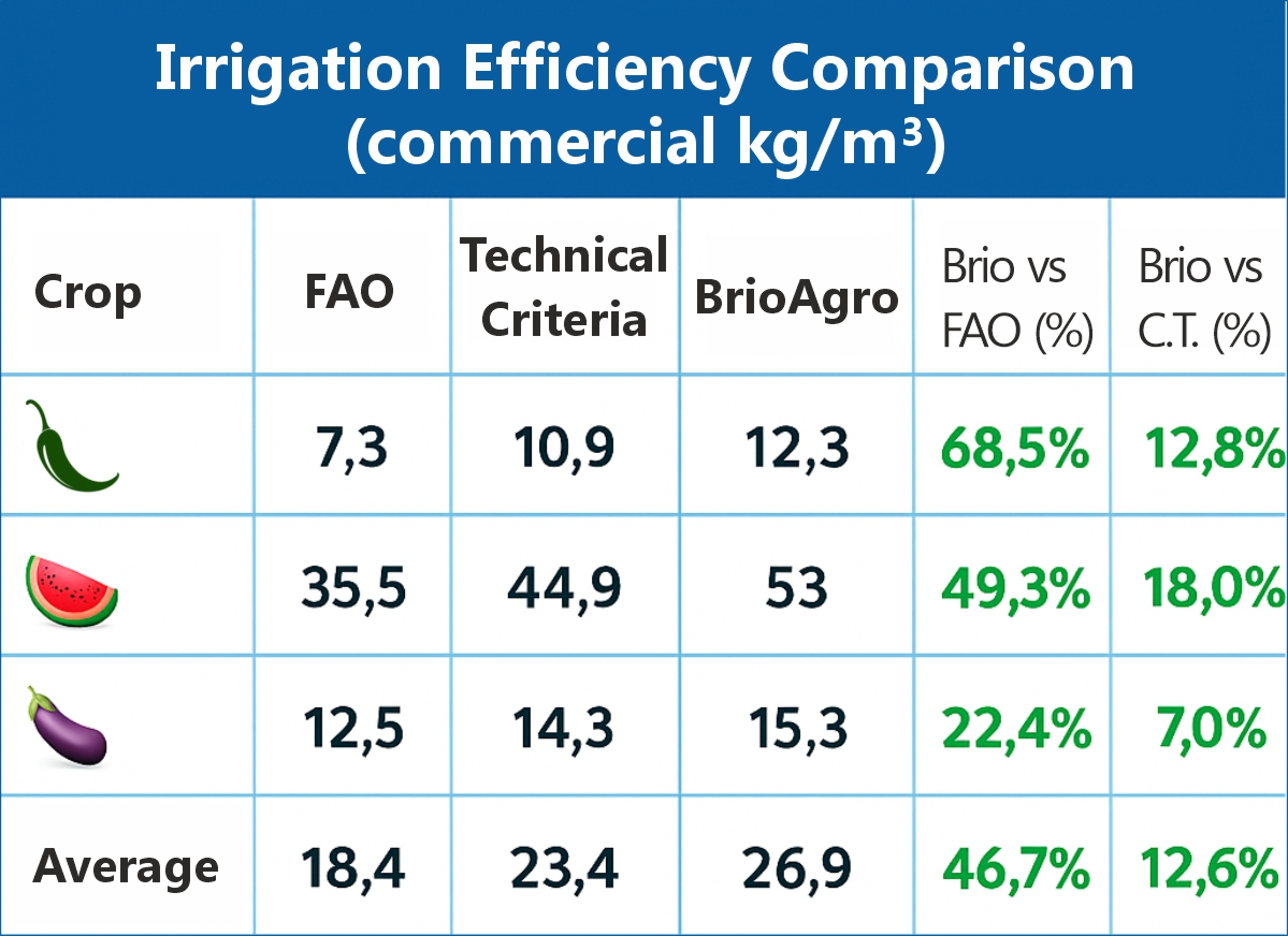 Irrigation efficiency in times of water deficit: results 2023–2025 and the value of real-time adaptation. Below, we show how BrioAgro outperforms the most commonly used irrigation decision methods, with successful cases in pepper, watermelon, and eggplant: a complete analysis with climatic context.